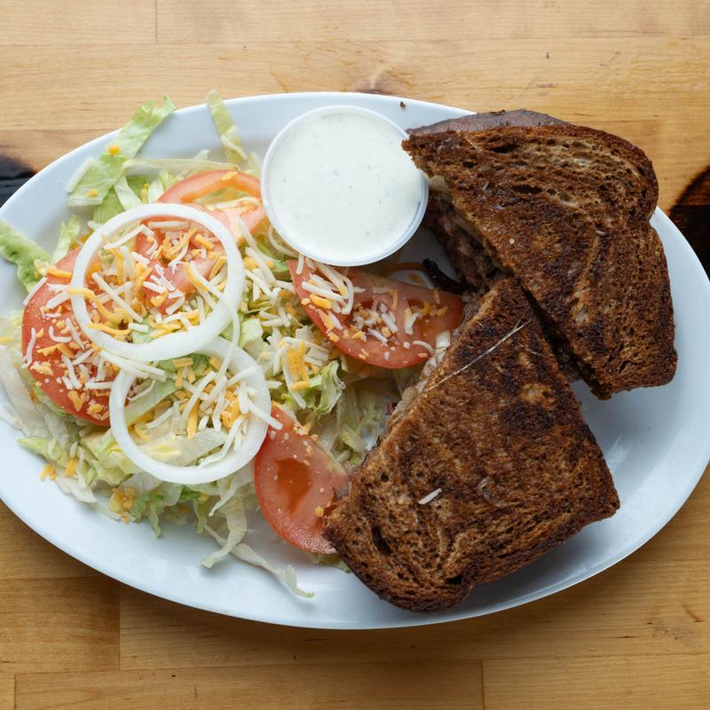 Corned beef on rye bread with sauerkraut and 1,000 island dressing.